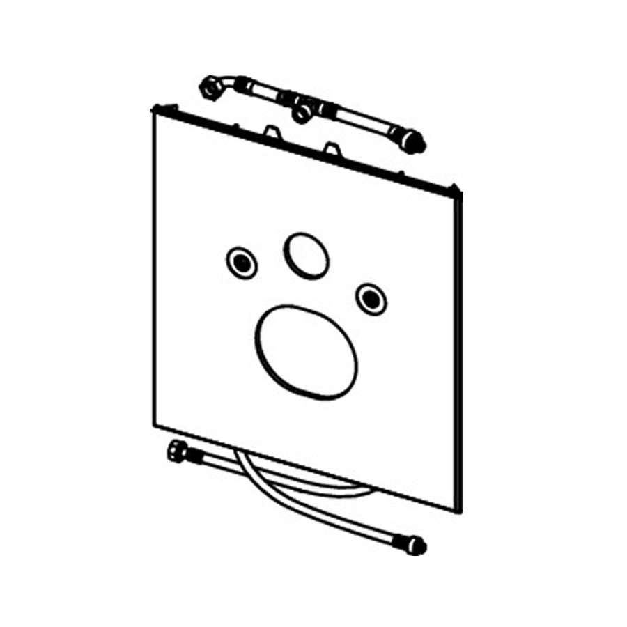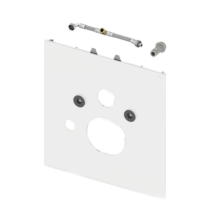 Dolna obudowa szklana do łączenia z toaletą myjącą Geberit Aquaclean Sela, Mera i Tuma, Toto Washlet SG, Toto Washlet EK lub GL z ukrytymi przyłączami, Grohe Sensia, V & B ViClean U+ lub Laufen Riva, w tym samoprzylepna taśma wygłuszająca i wymienny wąż przyłączeniowy do spłuczki oraz adapter z tworzywa 3/8" do zaworu napełniającego F 10.- wymiary: 446 x 430 x 16 mm