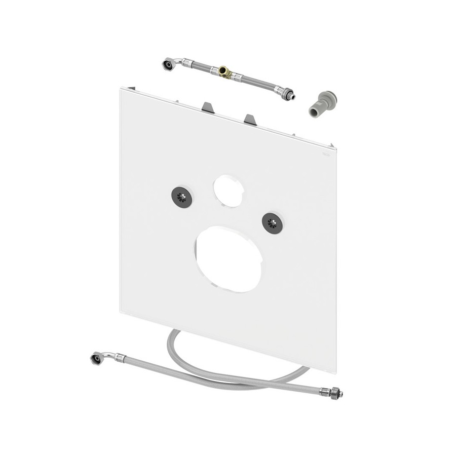 Dolna obudowa szklana do łączenia z toaletą myjącą Duravit SensoWash C oraz Slim lub V & B ViClean L, w tym samoprzylepna taśma wygłuszająca, wymienny długi wąż przyłączeniowy do spłuczki oraz adapter z tworzywa 3/8" do zaworu napełniającego F 10.- Wymiary: 446 x 430 x 16 mm