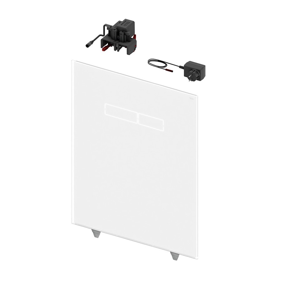 Górna obudowa szklana do modułu TECElux z elektroniczną funkcją uruchamiania "sen-Touch" wraz z elementami montażowymi. W tym zasilacz wtykowy (napięcie przyłączeniowe 230 V) z silnikiem do podwójnego spłukiwania.Instalacja tylko w połączeniu z dolną obudową szklaną z przyłączem WC