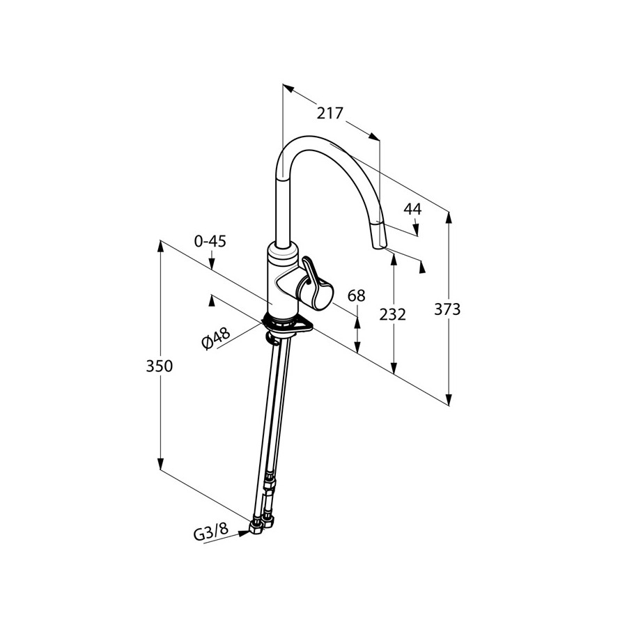 Jednouchwytowa bateria kuchenna DN 15 z uchwytem prostym, do montażu jednootworowego, przepływ wody 5 l/min i perlatorem Cache M 16,5x1, z głowicą ceramiczną z ogranicznikiem wypływu gorącej wody, z obrotową wylewką (360°), z systemem szybkiego montażu i elastycznymi wężykami ciśnieniowymi G 3/8, I grupa akustyczna. Do bezciśnieniowych urządzeń grzewczych.