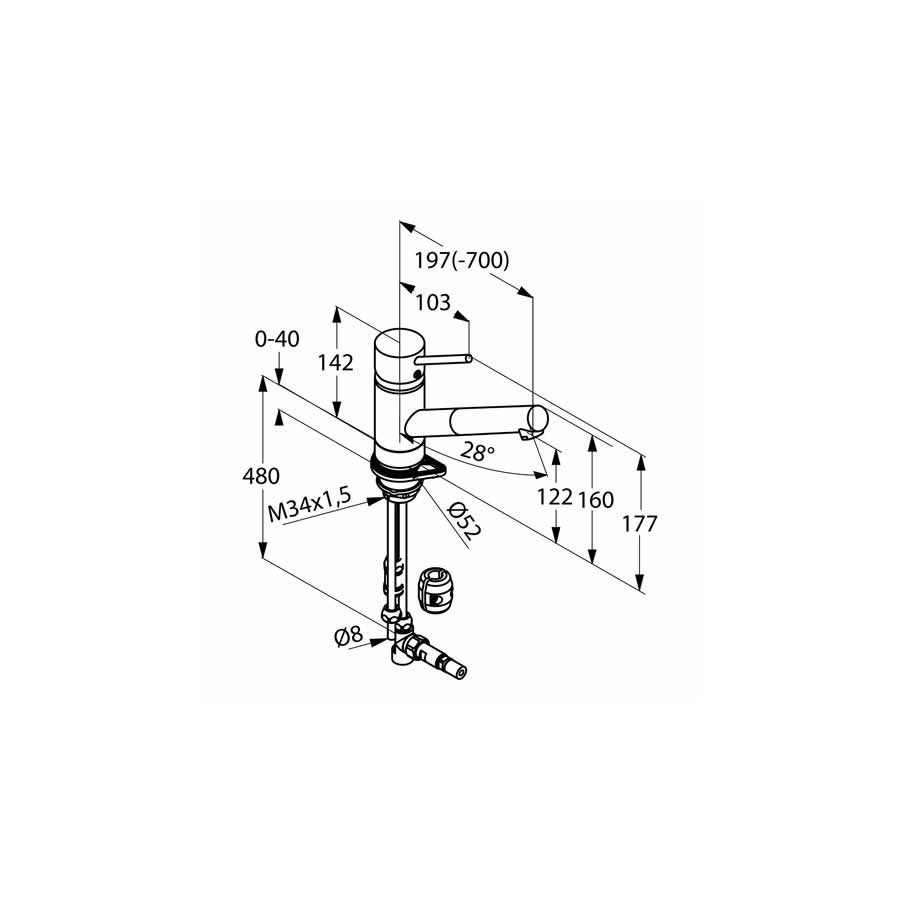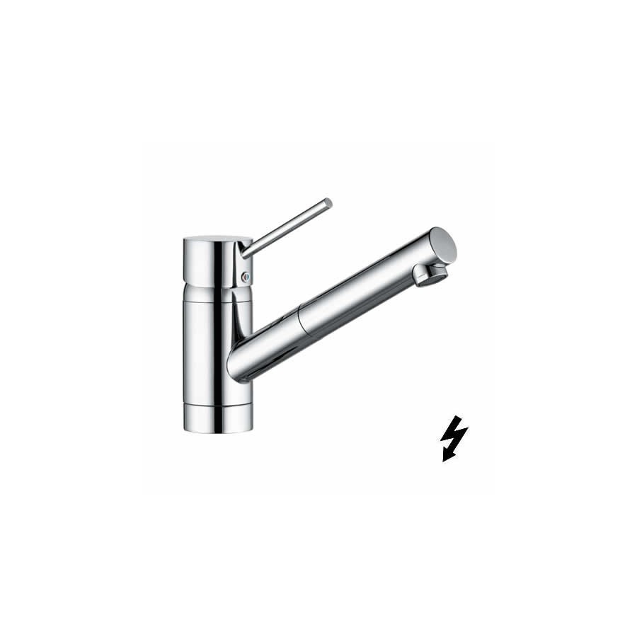 Jednouchwytowa bateria kuchenna DN 8 do bezciśnieniowych urządzeń grzewczych, , z uchwytem prostym, montaż jednootworowy, z przepływem wody 5 l/min, z perlatorem M 24x1, z głowicą ceramiczną z ogranicznikiem wypływu gorącej wody. Bateria z wyciąganą, obrotową wylewką (110°), rurkami miedzianym 8 mm, I grupa akustyczna.