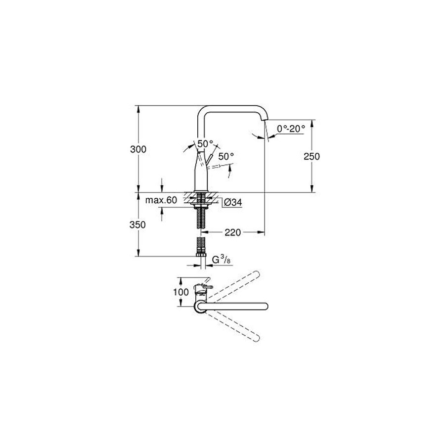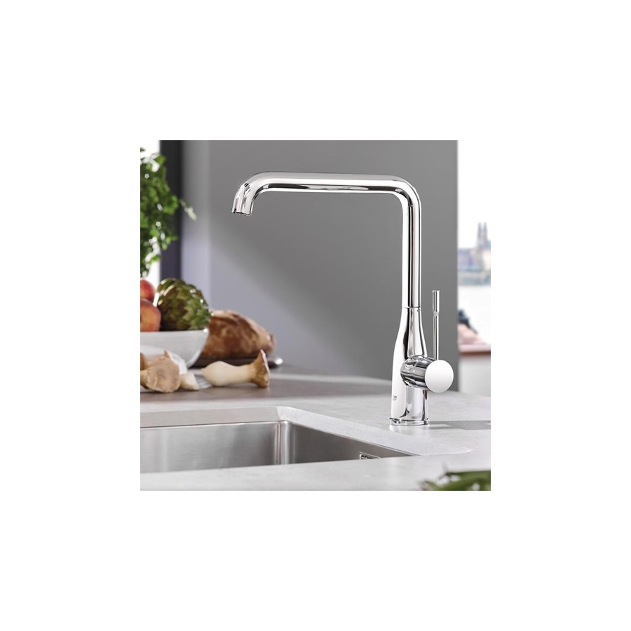 Jednouchwytowa wysoka bateria zlewozmywakowa, do montażu jednootworowego, z głowicą ceramiczną 28 mm z GROHE SilkMove®, ze zintegrowanym ogranicznikiem temperatury, z powłoką chromową z GROHE StarLight®, z regulowanym ogranicznikiem strumienia przepływu. Bateria posiada obrotową wylewką z regulowanym polem wychylenia 0°/150°/360°, perlator, giętkie węże przyłączeniowe, system szybkiego montażu.