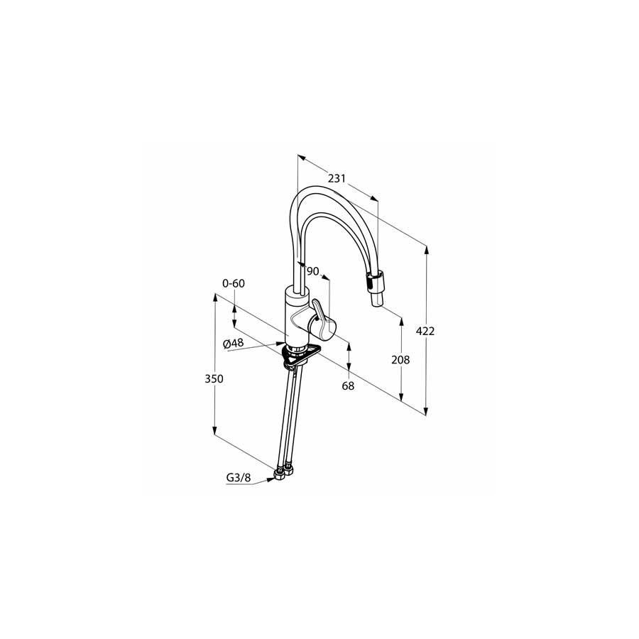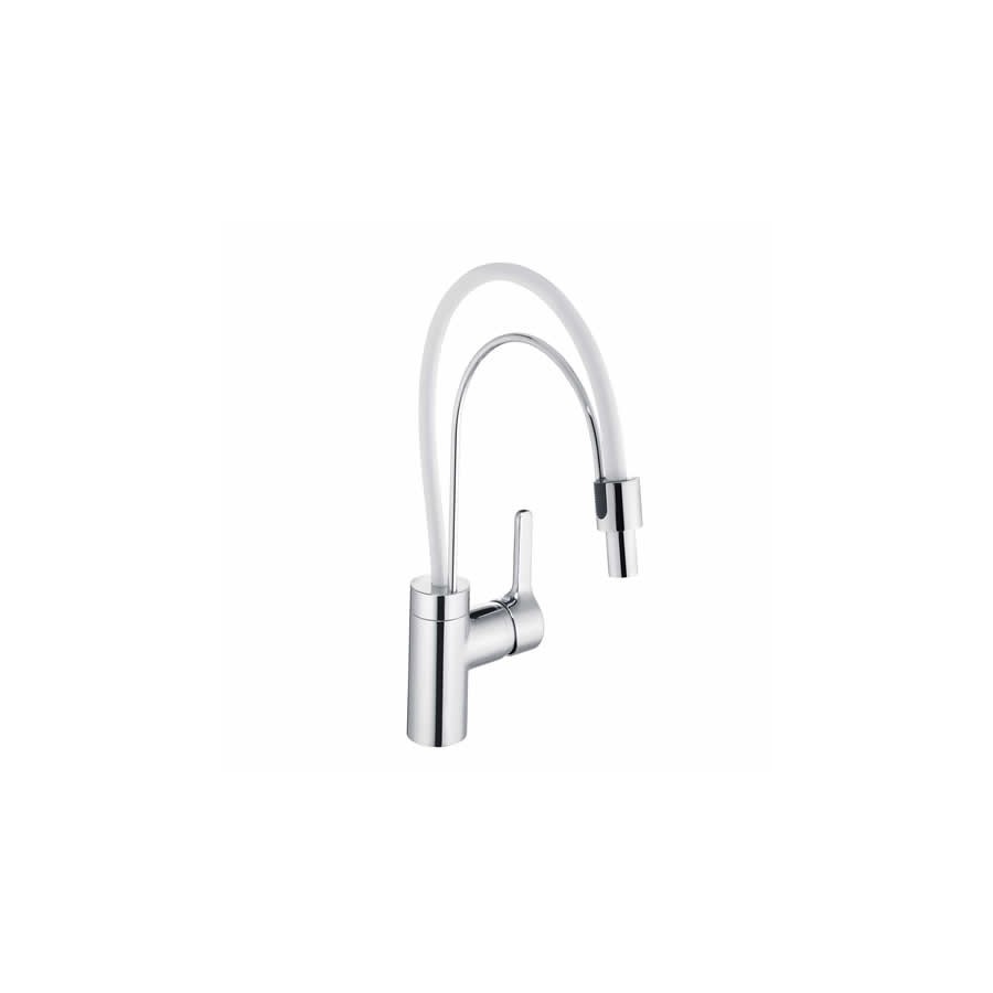 Jednouchwytowa bateria kuchenna DN 15, z uchwytem prostym, do montażu jednootworowego, z perlatorem Cache M 16,5x1, głowicą ceramiczną z ogranicznikiem wypływu gorącej wody. Bateria posiada wyciąganą, obrotową wylewką (360°), zawór zwrotny, system szybkiego montażu, elastyczne wężyki ciśnieniowe G 3/8. I grupa akustyczna, klasa przepływu Z.