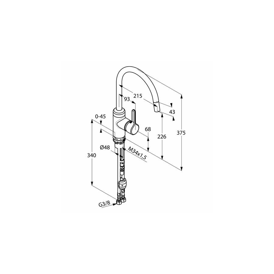 Jednouchwytowa bateria kuchenna DN 10 z uchwytem prostym, montażem jednootworowym, klasą przepływu Z, perlatorem Cache M 16,5x1, głowicą ceramiczną z ogranicznikiem wypływu gorącej wody, z wyciąganą, obrotową wylewką (230°), z elastycznymi wężykami ciśnieniowymi G 3/8, zaworem zwrotnym, I grupa akustyczna. Bateria w kolorze stal szlachetna (na zdjęciu bateria w kolorze chrom).