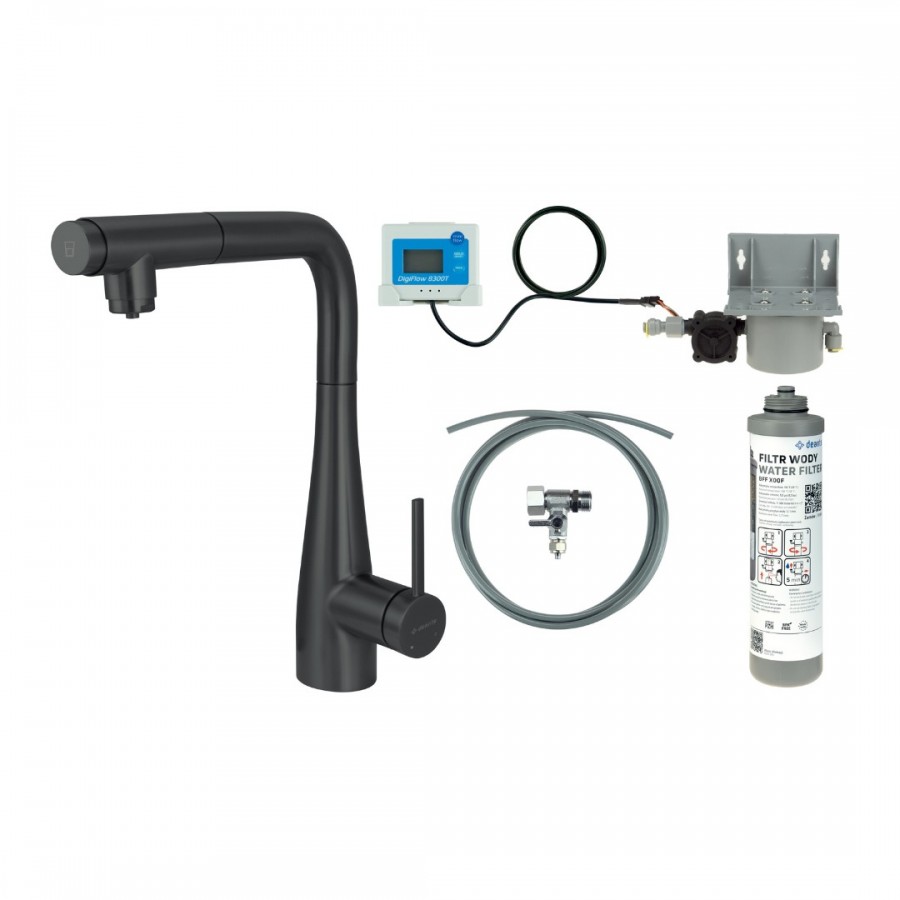 Opis produktu Deante Eridan bateria kuchenna stojąca z wyciąganą wylewką z zestawem do filtracji wody czarny mat BREFN75M