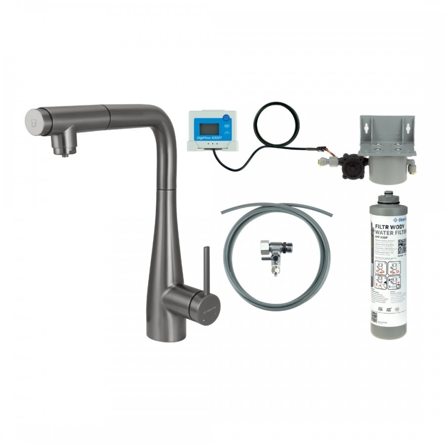 Opis produktu Deante Eridan bateria kuchenna stojąca z wyciąganą wylewką z zestawem do filtracji wody titanium BREFD75M