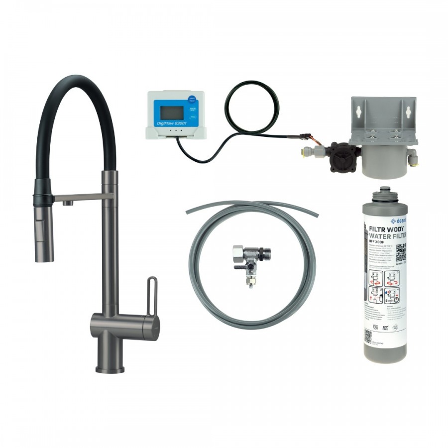 Opis produktu Deante Magnetic bateria kuchenna stojąca z wyciąganą wylewką z zestawem do filtracji wody titanium BRMFD75M