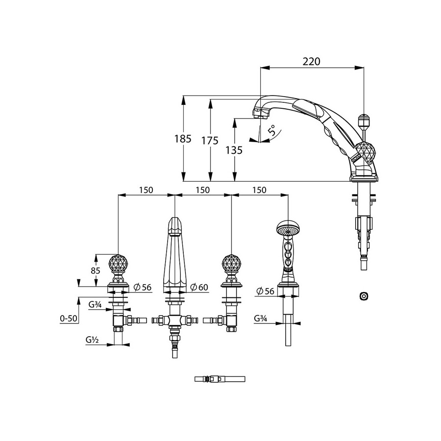 Opis produktu Kludi Adlon bateria wannowa pozłacana uchwyty przezroczyste Swarovski 5152445G4