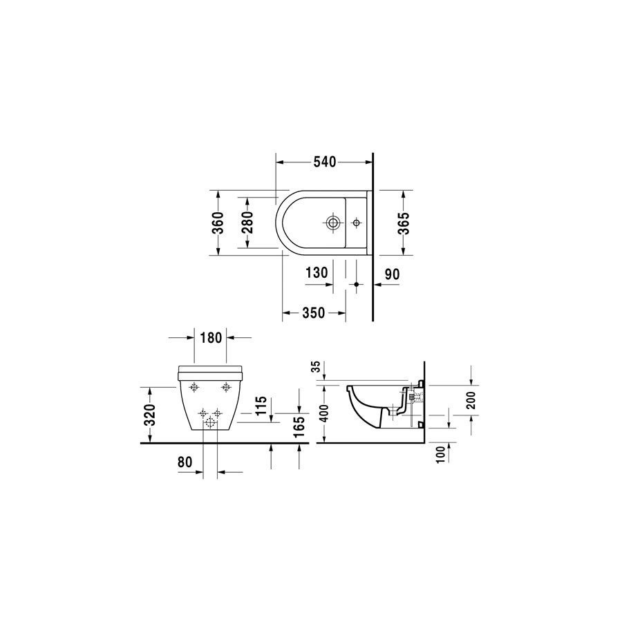 Bidet wiszący 54x36 cm, z przelewem i półką na baterię. W komplecie mocowanie Durafix. W przypadku montażu bez stelaża podtynkowego zalecane jest mocowanie 006500.