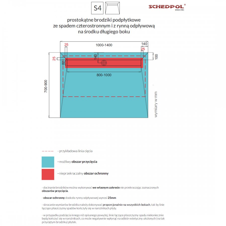 Opis produktu Schedpol Base brodzik podpłytkowy 4-spadowy 90x100 cm z rusztem do zabudowy długi bok 10010/OLDB