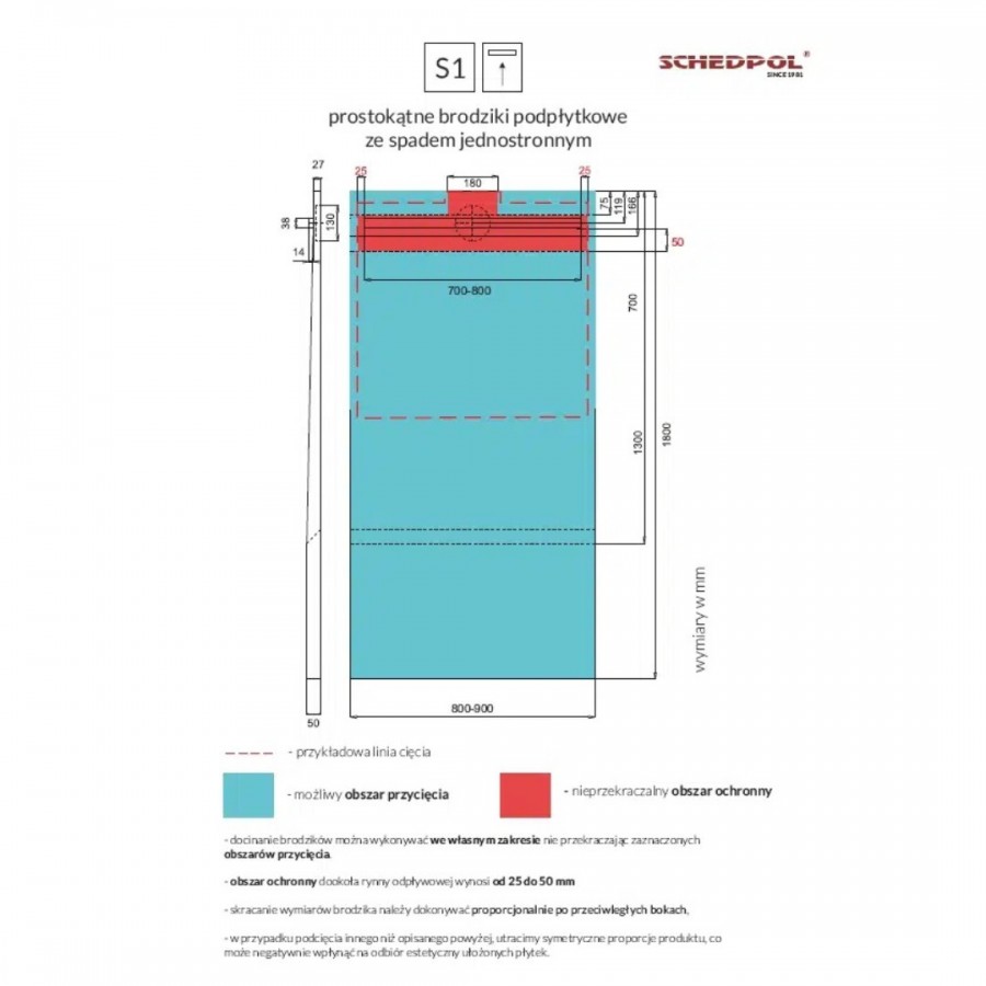 Opis produktu Schedpol Slim Lux brodzik podpłytkowy 1-spadowy 130+50x80 cm z rusztem do zabudowy krótki bok 10.114/OLPL