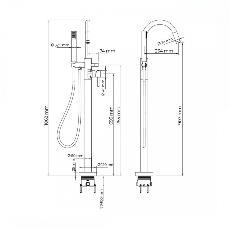 - całkowita wysokość baterii 106,2 cm, wysokość wypływu wody 90,7 cm