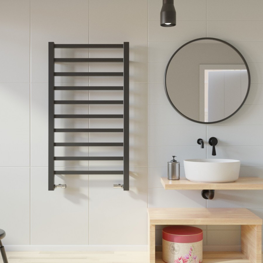 Opis produktu Imers Tell 1 grzejnik łazienkowy 79x43 cm czarny mat 1112/CZM