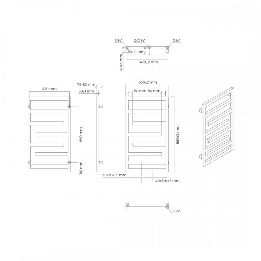- rozstaw podłączeń: 47 cm / 5 cm (montaż zaworów na kolektorach pionowych lub dolne środkowe o rozstawie 50 mm z możliwością podłączenia grzałki elektrycznej po lewej lub po prawej stronie grzejnika)