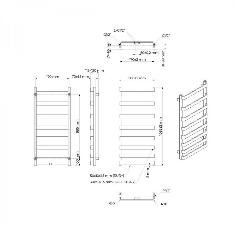 - rozstaw podłączeń: 47 cm / 5 cm (montaż zaworów na kolektorach pionowych lub dolne środkowe o rozstawie 50 mm z możliwością podłączenia grzałki elektrycznej po lewej lub po prawej stronie grzejnika)