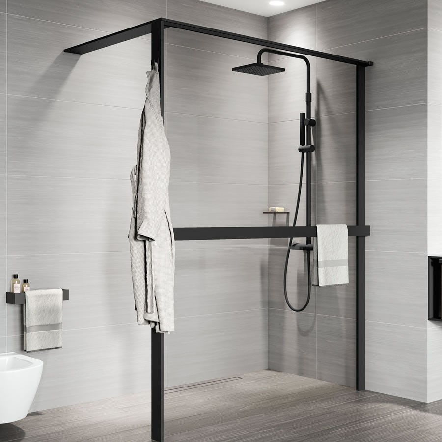 Opis produktu Novellini Kuadra HWS ścianka wolnostojąca Walk-in 90 cm z relingiem prawa czarny mat