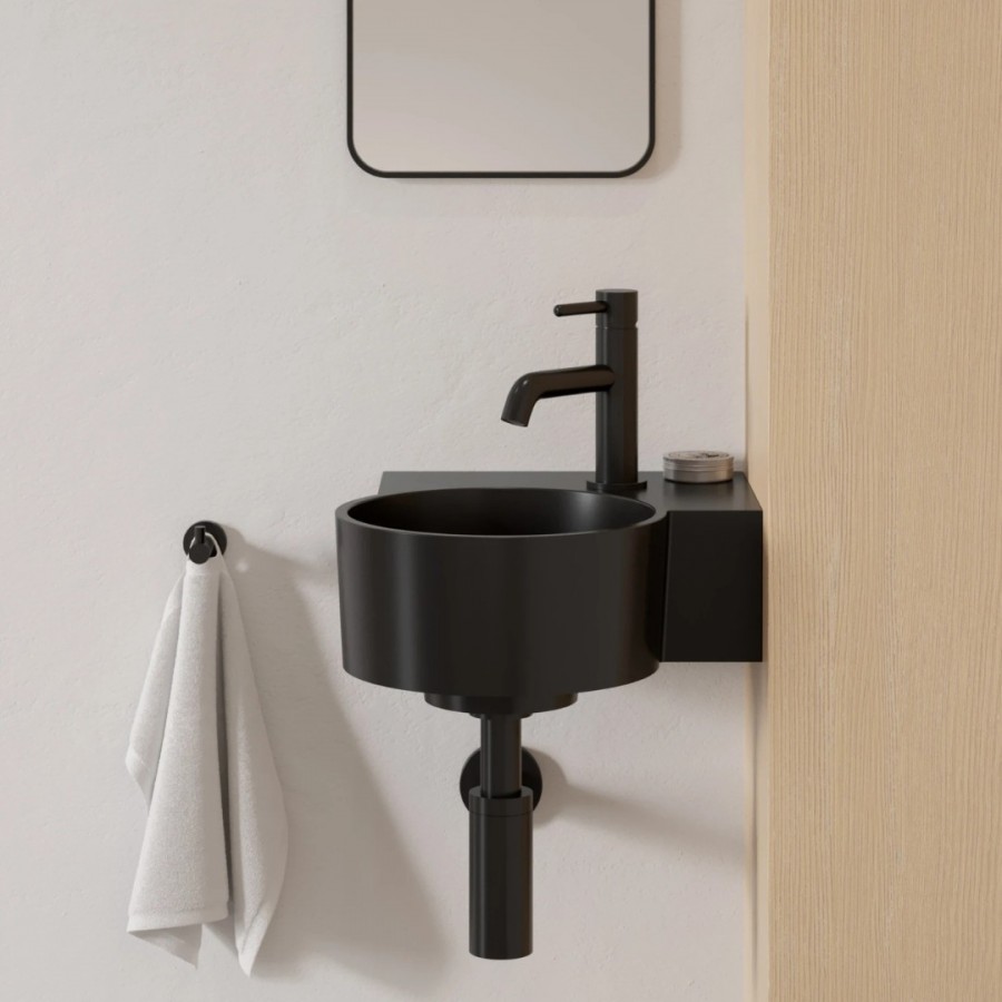 OVO w kolorze black lava (RAL9005) to umywalka w wyrazistym odcieniu czerni, o aksamitnej w dotyku, matowej powierzchni.