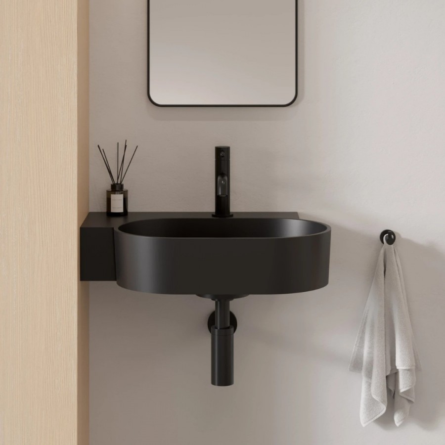Opis produktu Omnires Ovo M+ umywalka ścienna-nablatowa 55x38 cm lewa czarny lava mat OVO555UWLBLV
