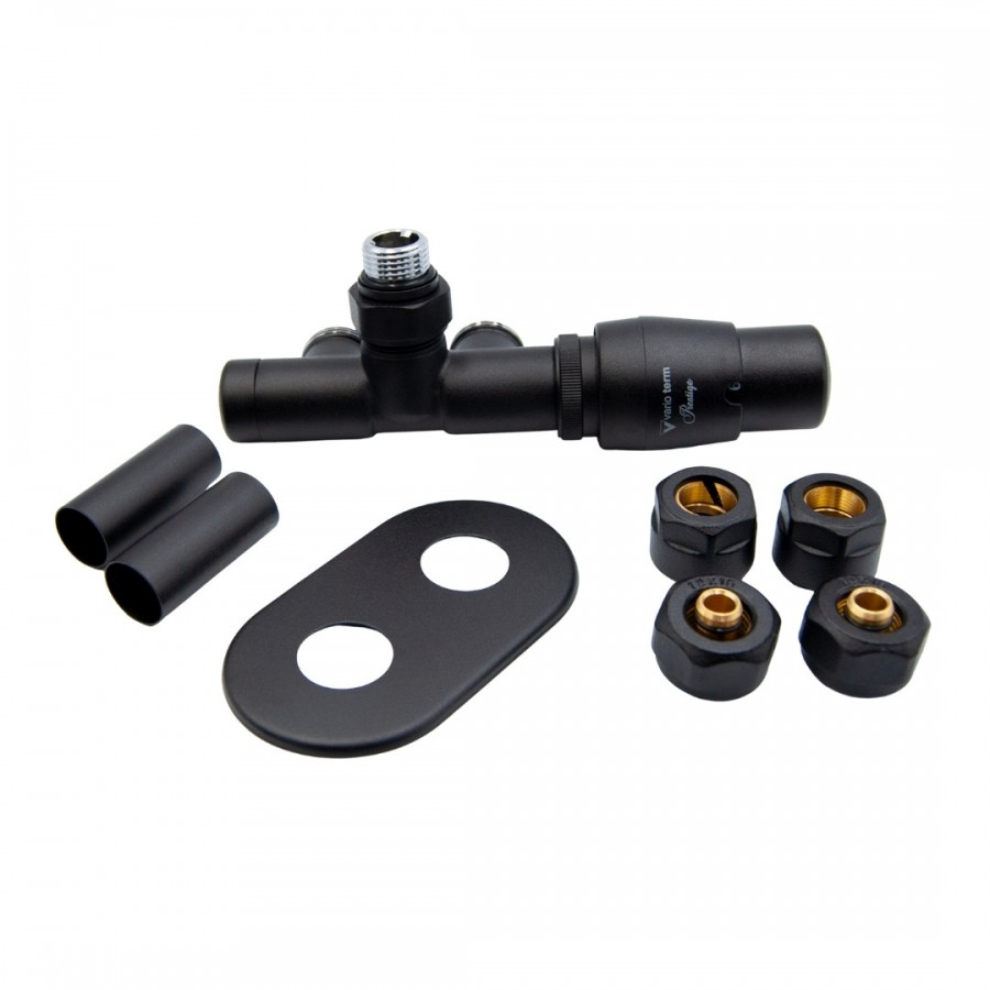 Zestaw do grzejników z pionowymi kolektorami pozwalającymi na zastosowanie grzałki elektrycznej. Rozstaw podłączenia do instalacji 50 mm. GZ ½” / GZ ¾” x GZ ¾”. Kolor: czarny matowy.Zestaw zawiera: