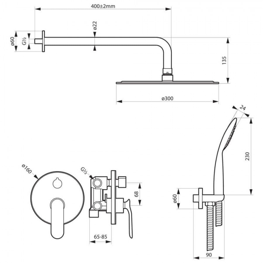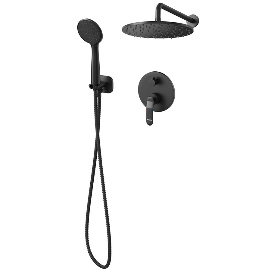 Podtynkowy zestaw prysznicowy składający się z baterii podtynkowej, deszczownicy ze ściennym ramieniem oraz słuchawki prysznicowej. Kolor: czarny mat.Massi Concepcion kompletny zestaw prysznicowy czarny mat MSBP-C007P