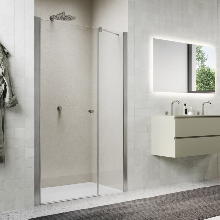 Dane techniczne :- rodzaj produktu : drzwi prysznicowe jednoczęściowe ze ścianką stałą w linii - ścianka stała od strony uchwytu