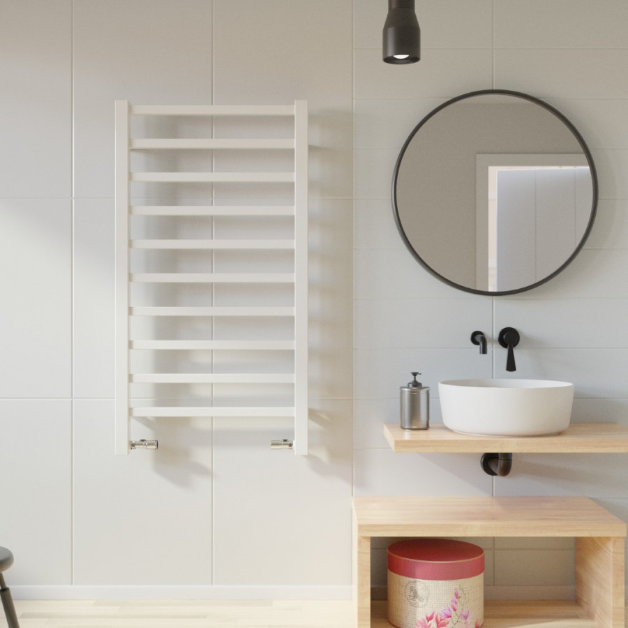 Opis produktu Imers Tell 1 grzejnik łazienkowy 79x43 cm biały mat 1112/BIM