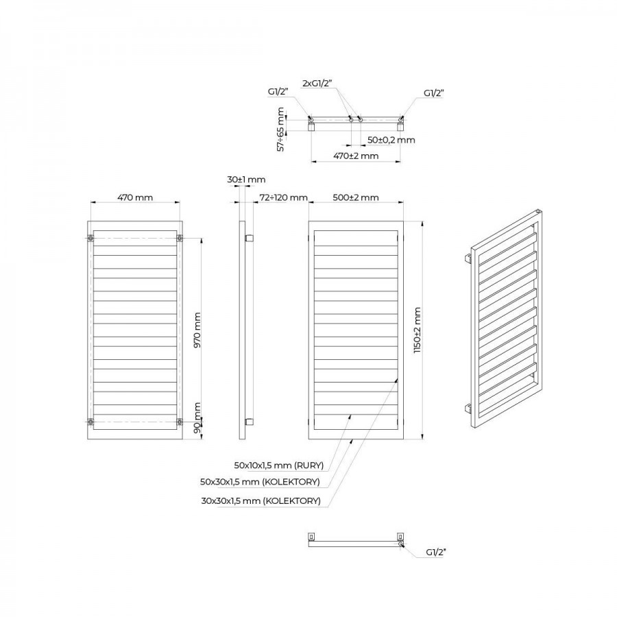 - rozstaw podłączeń: 47 cm / 5 cm (montaż zaworów na kolektorach pionowych lub dolne środkowe o rozstawie 50 mm z możliwością podłączenia grzałki elektrycznej po lewej lub po prawej stronie grzejnika)