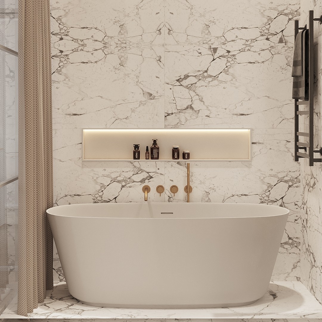 Dość oczywistym stylem dla złotej armatury jest glamour pełen przepychu. W takim przypadku najlepiej wygląda z dużymi płytkami imitującymi marmur. To bardzo eleganckie połączenie.
