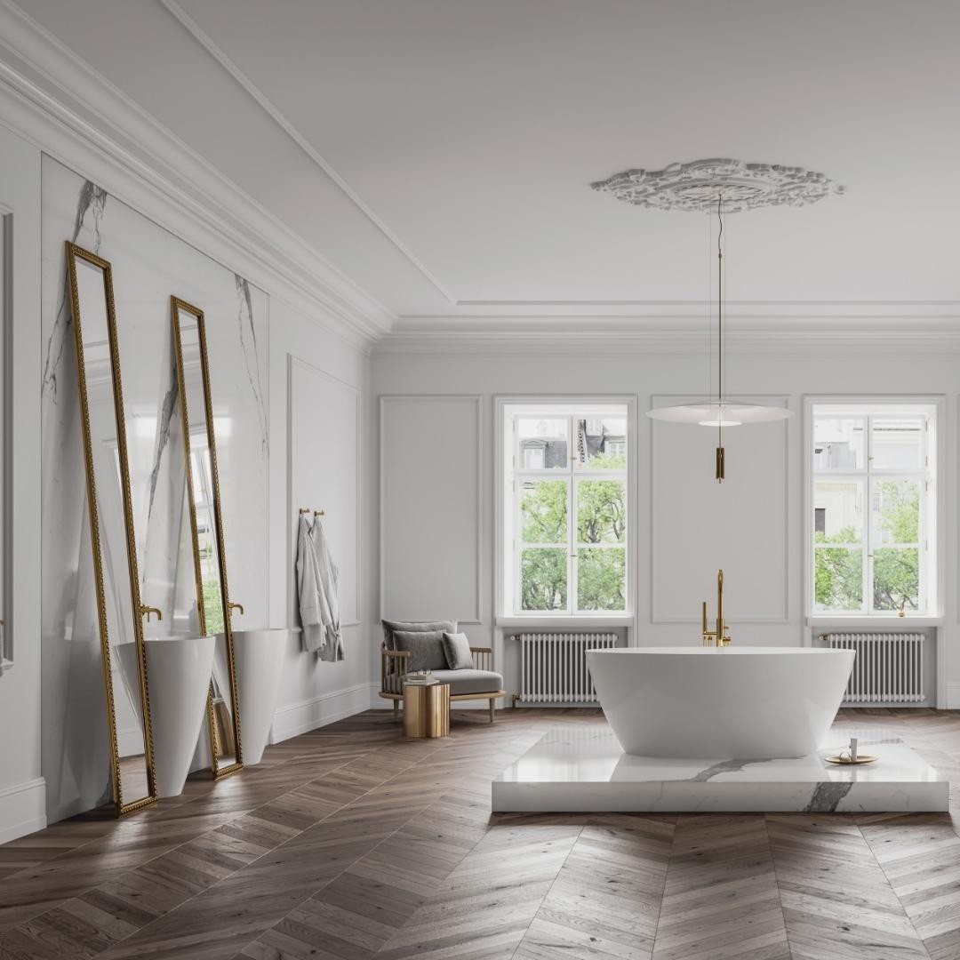 Jak już wspomniałam ważnym elementem wykończeniowym w łazience w stylu paryskim jest sztukateria. Powinna znaleźć pod sufitem – może mieć prostą lub dekoracyjną formę. Sztukateria pięknie prezentuje się również na frontach szafek łazienkowych.