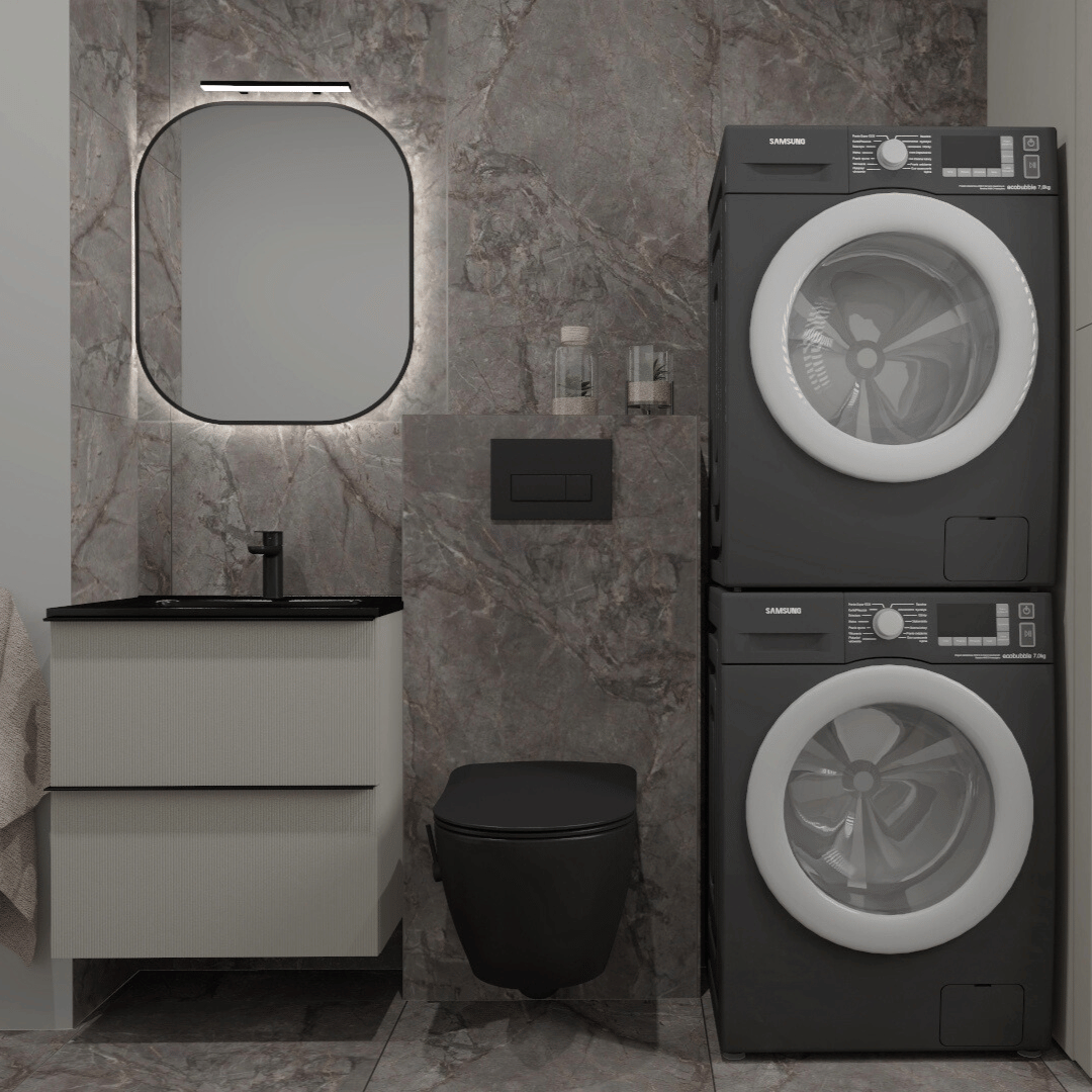 - Pralka: przed 90 × 100 cm, odległość od ściany: min. 5-10 cm.