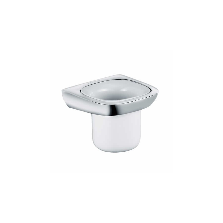 Uchwyt ze szklanką do montażu naściennego, szklanka wykonana z białej porcelany. W komplecie elementy mocujące.