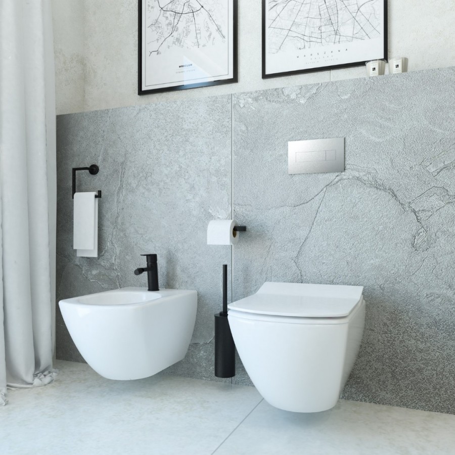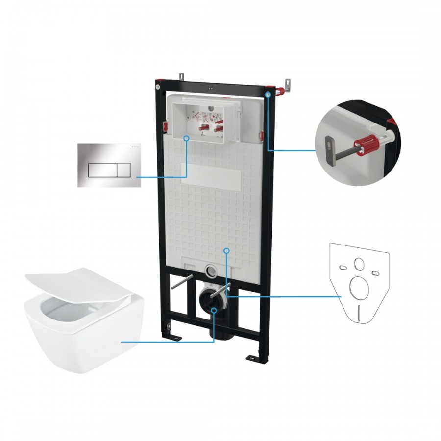 Opis produktu Deante Blur miska WC wisząca bez kołnierza z deską wolnoopadającą i stelaż podtynkowy z przyciskiem chrom CDZS6ZPW