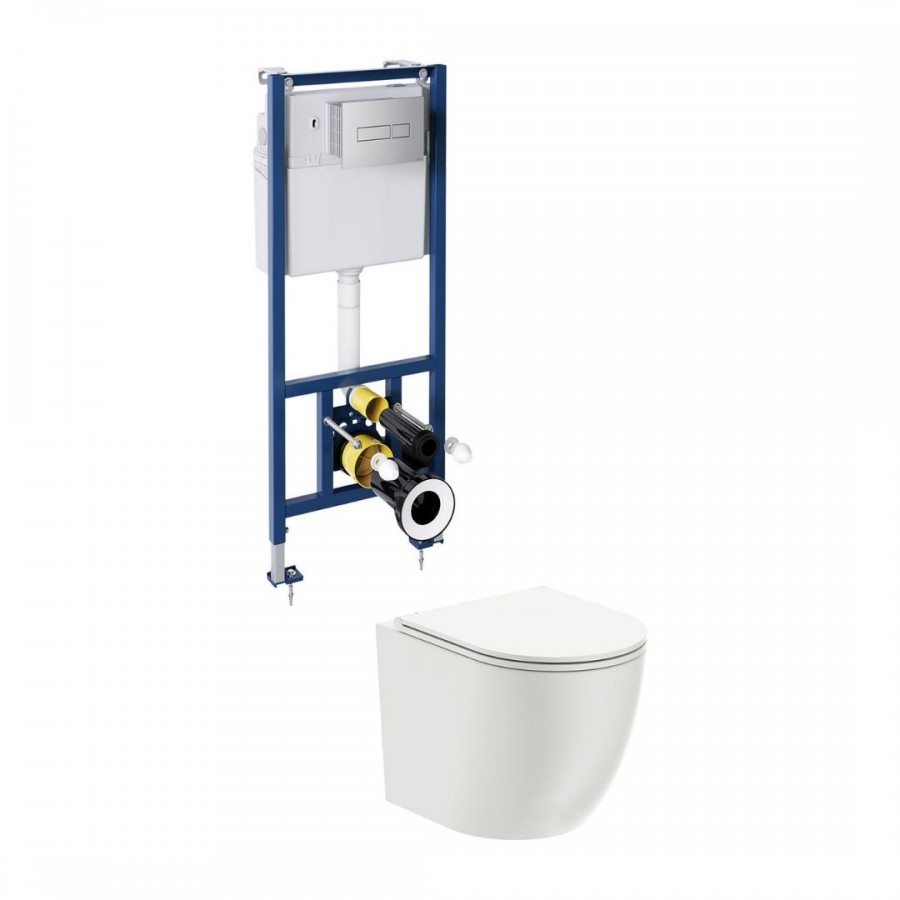 W zestawie znajduje się wisząca miska toaletowa OMNIRES OTTAWA z deską wolnoopadającą oraz stelaż podtynkowy OMNIRES CLASSIC z przyciskiem spłukującym o chromowanym wykończeniu.Miska z deską toaletową OMNIRES OTTAWA