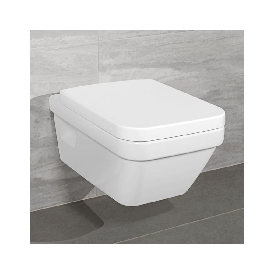 Wisząca miska WC w zestawie z deską wolnoopadającą (9M58S101). Miska WC 53x37 cm, bez kołnierza wewnętrznego, z technologią DirectFlush, brak kołnierza wewnętrznego gwarantuje lepszy dostęp do każdego miejsca miski dzieki czemu łatwiej utrzymać czystość. Deska wolnoopadająca posiada zawiasy ze stali szlachetnej oraz funkcje QuickRelease, wykonana z duroplastu.Villeroy&Boch Architectura Combi Pack miska wisząca bezrantowa z deską 5685HR01