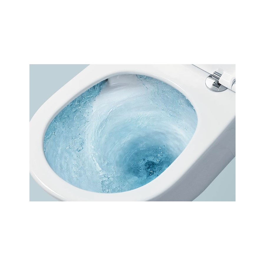Silny strumień wody wypływa z boku miski, tworząc spiralny ruch, który dokładnie czyści całą powierzchnię, ograniczając potrzebę użycia szczotki i zużywając nawet 50% mniej wody.