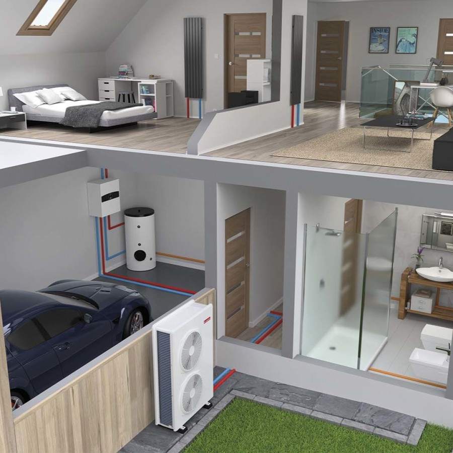 Inwerterowa pompa ciepła powietrze/woda do ogrzewania, chłodzenia i wytwarzania ciepłej wody użytkowej ze zbiornikiem o pojemności 190 l. Obwód chłodniczy jest hermetycznie zamknięty wewnątrz jednostki zewnętrznej. Gazowy czynnik chłodniczy kończy cykl termodynamiczny, a wymiana cieplna z wodą systemową zachodzi w jednostce zewnętrznej.- nowoczesny i funkcjonalny design