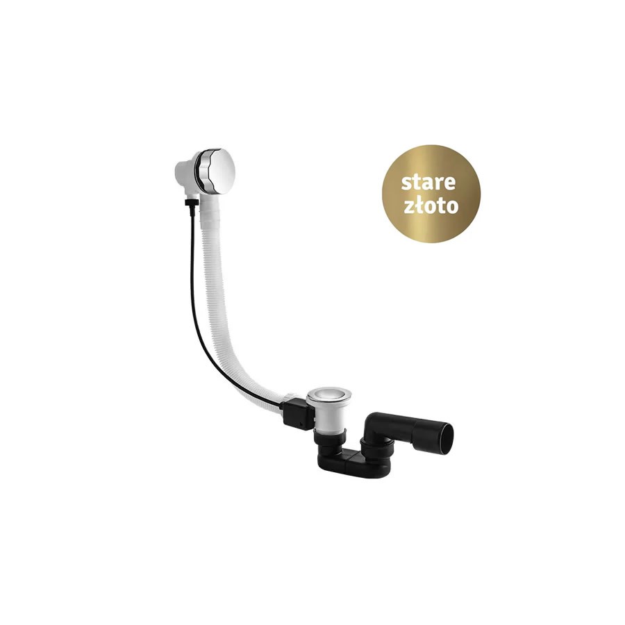 Przelew wannowy z syfonem do odpływu 40/50 mm. Rura przelewowa o długości 57 cm. Z korkiem odpływowym i korkiem przelewu wody wykonanym z mosiądzu w kolorze stare złoto.