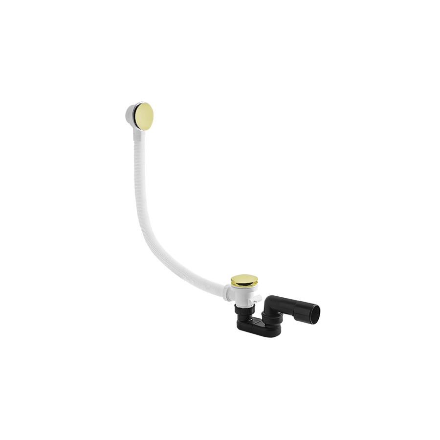 Przelew wannowy z korkiem klik klak z syfonem do odpływu 40/50 mm. Rura przelewowa o długości 70 cm. Z korkiem odpływowym i korkiem przelewu wody wykonanym z mosiądzu w kolorze złotym. Powłoka PVD - gładka powierzchnia i podwyższona odporność na zarysowania.