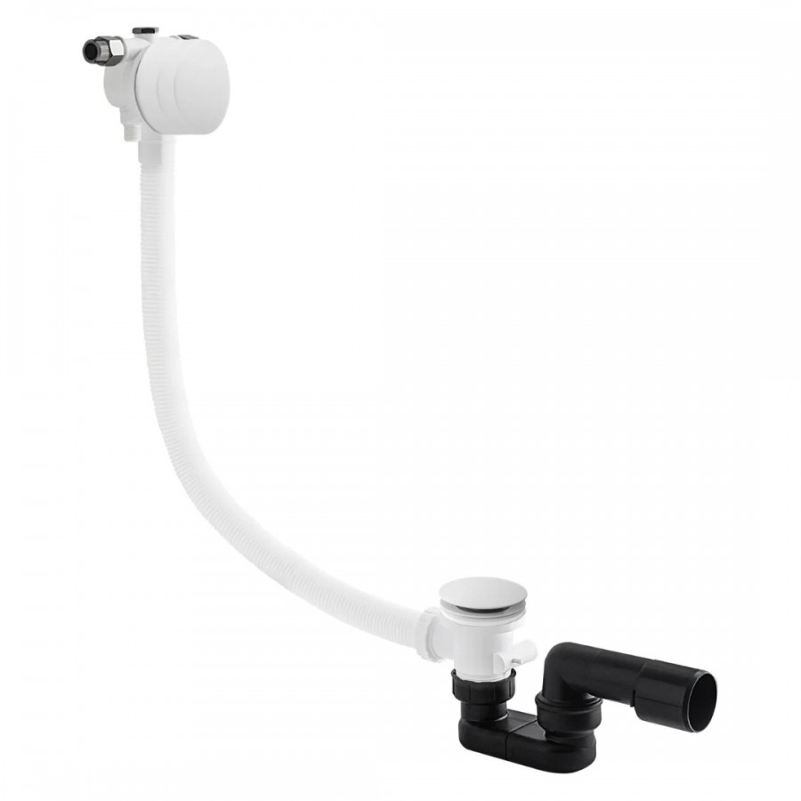 Przelew wannowy z korkiem klik klak z funkcją napełniania z syfonem do odpływu 40/50 mm. Rura przelewowa o długości 70 cm. Z korkiem odpływowym i korkiem przelewu wody wykonanym z mosiądzu w kolorze biały mat.