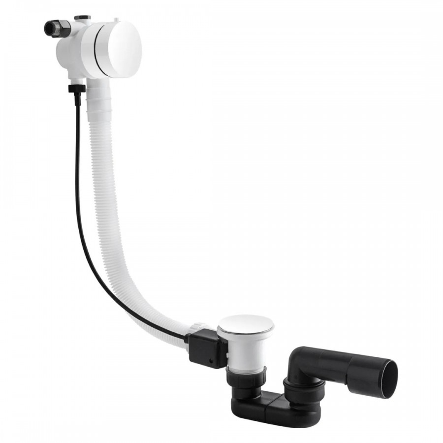 Przelew wannowy z funkcją napełniania z syfonem do odpływu 40/50 mm. Rura przelewowa o długości 100 cm. Z korkiem odpływowym i korkiem przelewu wody wykonanym z mosiądzu w kolorze biały mat.