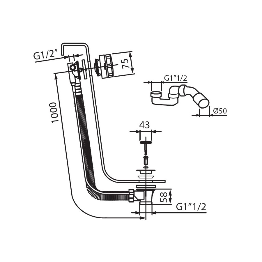 Przelew wannowy z funkcją napełniania z syfonem do odpływu 40/50 mm. Rura przelewowa o długości 100 cm. Z korkiem odpływowym i korkiem przelewu wody wykonanym z mosiądzu w kolorze stare złoto.