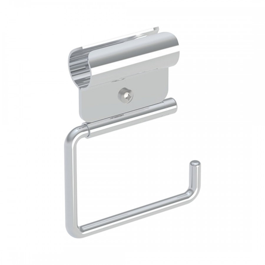 Gładki uchwyt na papier toaletowy z zaciskiem do montażu na poręczy o średnicy 32 mm, wykonany ze stali nierdzewnej.