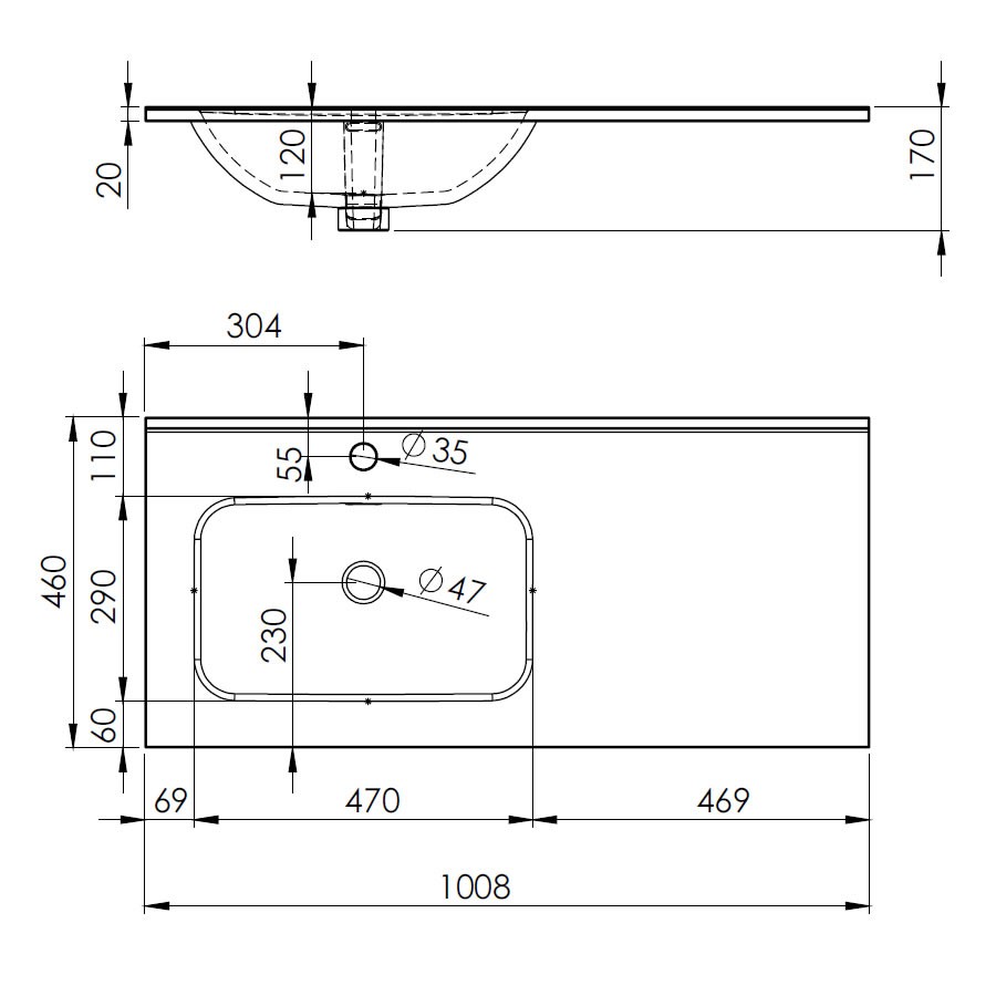 Meblowa umywalka ceramiczna 101x1,8x46,6 cm, z wydłużonym blatem po prawej stronie, posiada otwór na baterię i przelew. Umywalka przeznaczona do kompletowania z szafkami Look 60 cm i 40 cm.