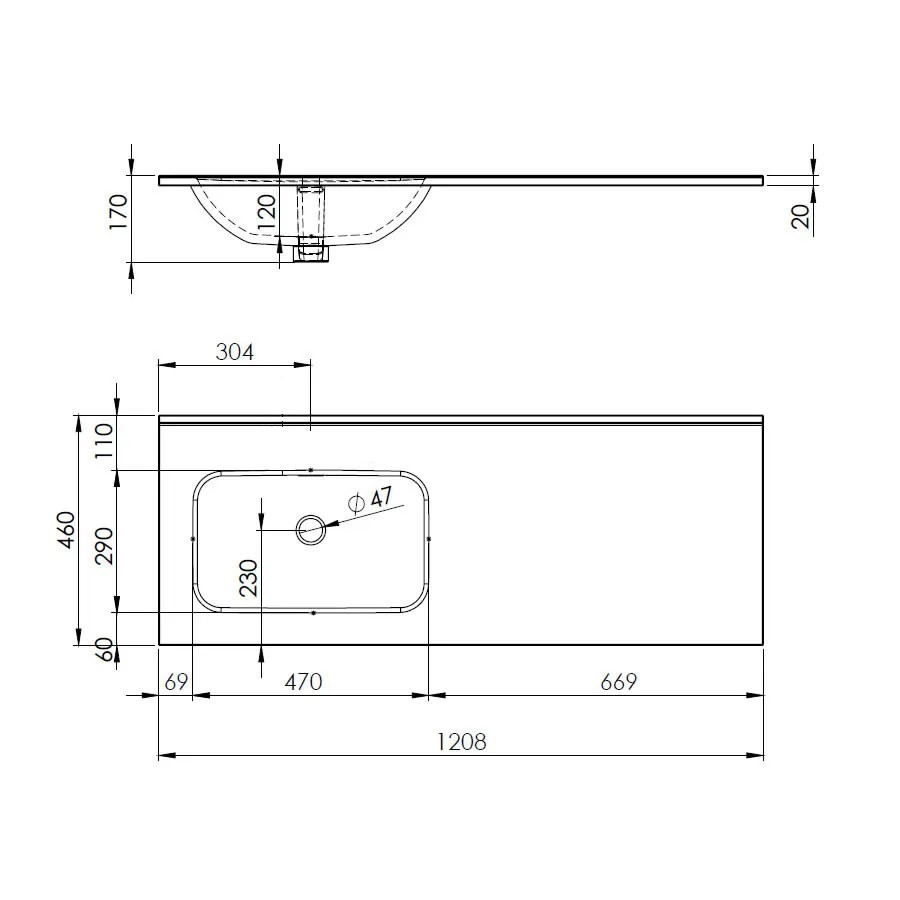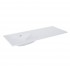 Meblowa umywalka 121x1,8x46,4 cm z wydłużonym blatem po prawej stronie. Ceramiczna umywalka bez otworu na baterię, z przelewem.