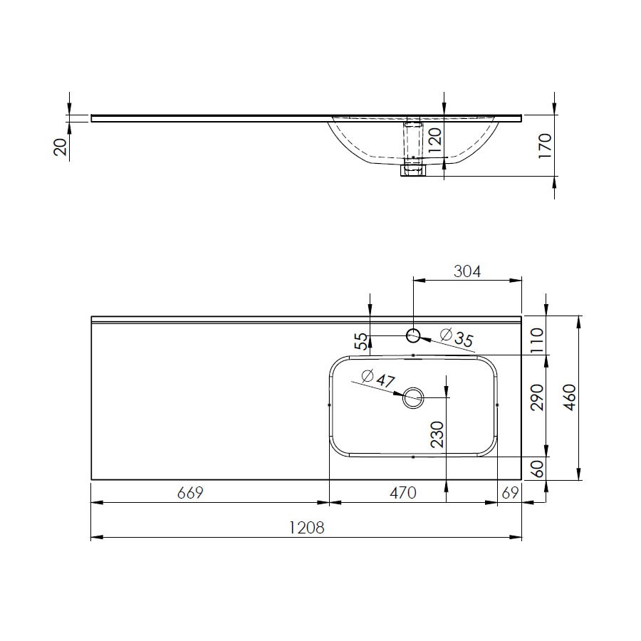 Meblowa umywalka 121x1,8x46,4 cm z wydłużonym blatem po lewej stronie. Ceramiczna umywalka z otworem pod baterię i przelew.