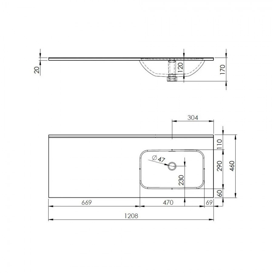 Meblowa umywalka 121x1,8x46,4 cm z wydłużonym blatem po lewej stronie. Ceramiczna umywalka bez otworu na baterię, z przelewem.
