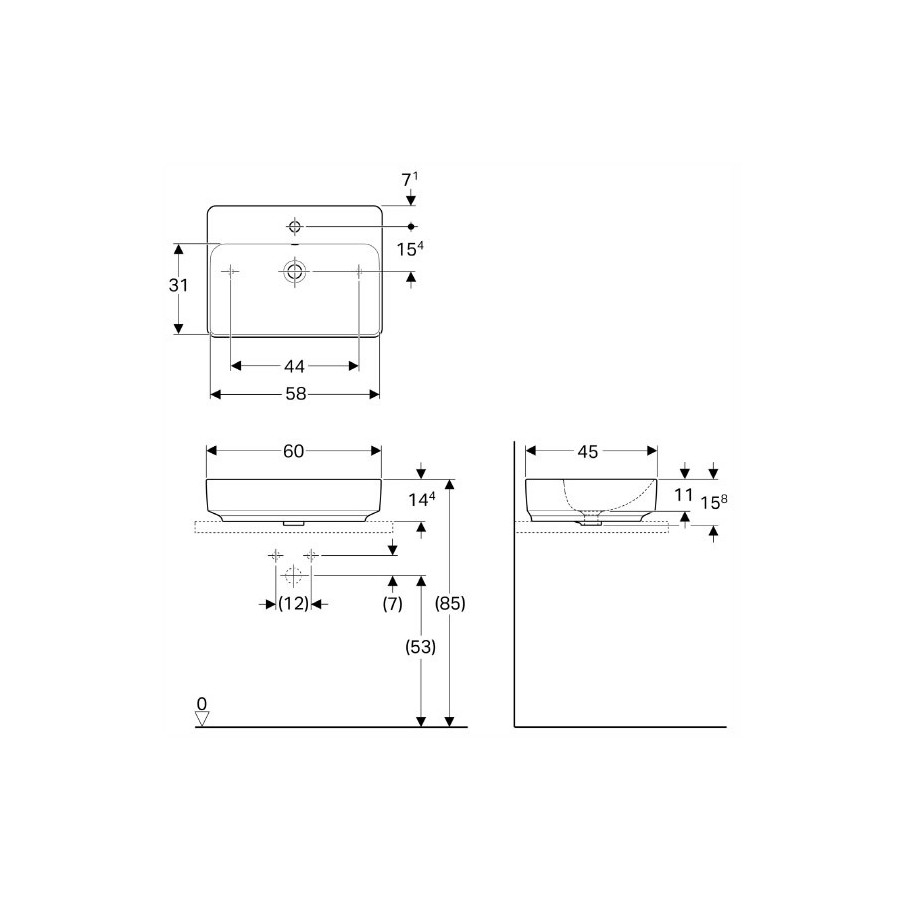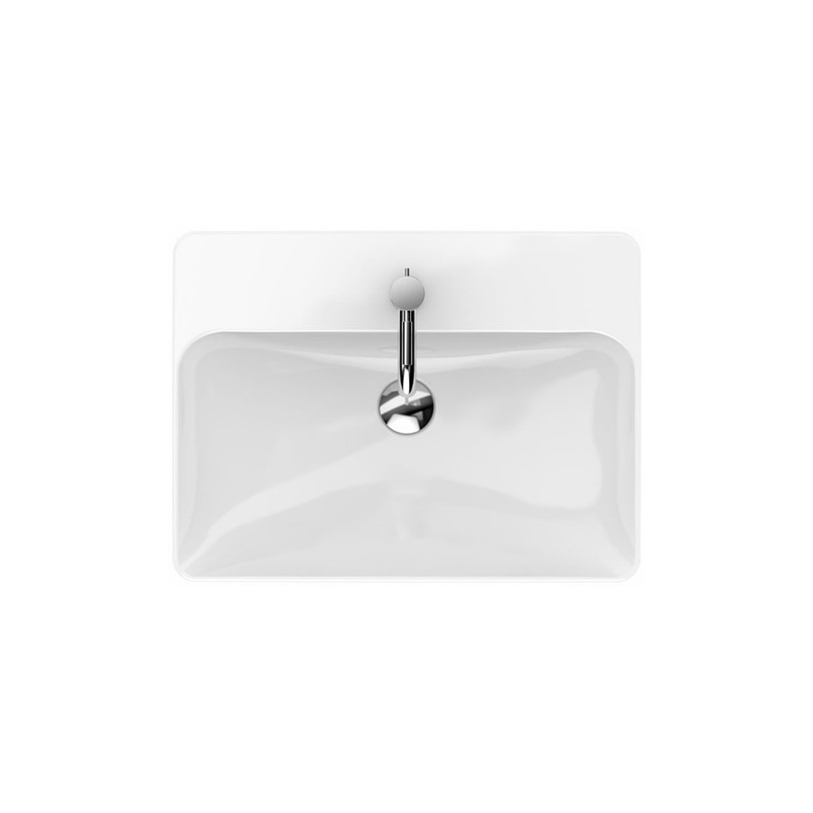 Umywalka 60x46 cm, montaż na blacie lub na meblu, z otworem na baterię oraz przelewem. W komplecie zestaw i szablon montażowy.