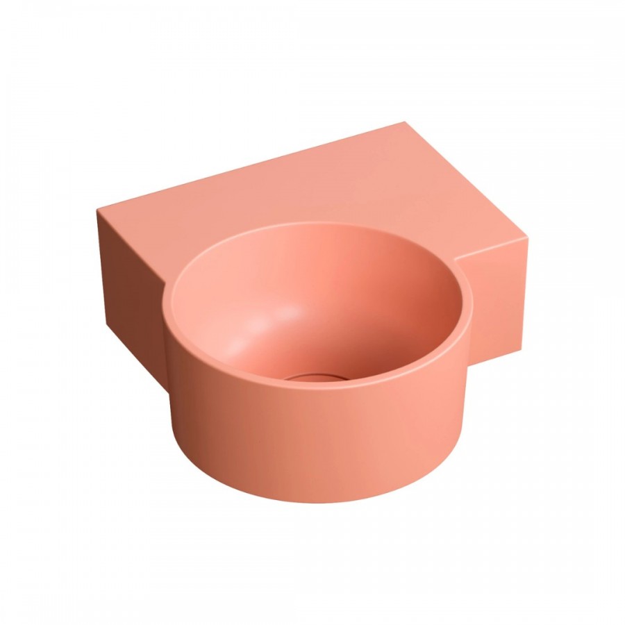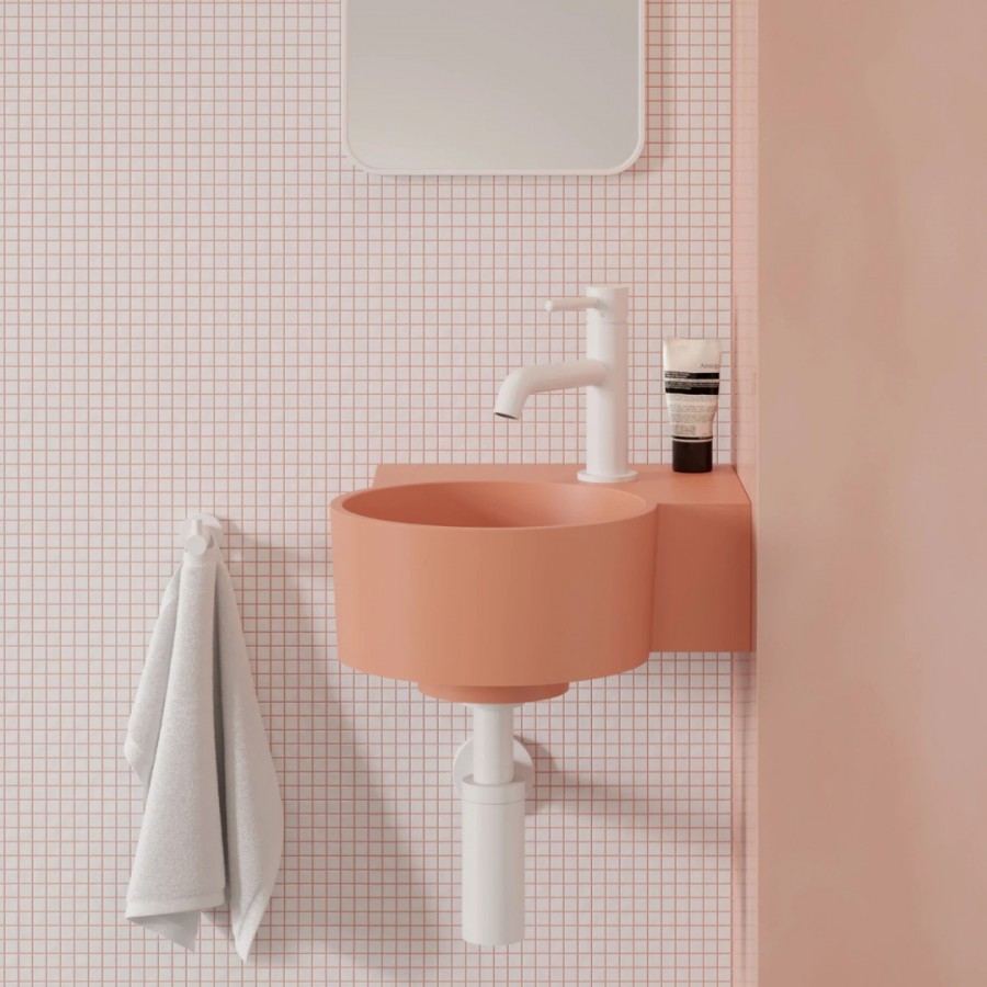 OVO w kolorze coral (RAL3012) to umywalka w subtelnym odcieniu różu, o aksamitnej w dotyku, matowej powierzchni.