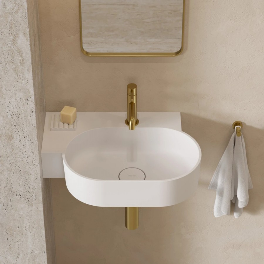 Umywalka z kolekcji OMNIRES OVO charakteryzuje się minimalistyczną, wyrazistą formą o doskonałych proporcjach. Powstały z zabawy geometrią kształt tworzą dwa przeciwległe półokręgi umywalki, połączone z prostokątną, funkcjonalną półką – idealnym miejscem do montażu baterii, a także do odstawienia kosmetyków czy innych niezbędnych akcesoriów. Harmonijnie wyprofilowane ścianki zostały wykończone płaskim, podkreślającym formę rantem, a idealnie dopasowana maskownica odpływu gwarantuje najwyższą estetykę. Od spodu umywalki zaprojektowano dyskretne, fabrycznie podcienione punkty, które wskazują miejsca na wykonanie otworów pod baterię lub dozownik, umożliwiając elastyczne dopasowanie armatury do indywidualnych potrzeb.