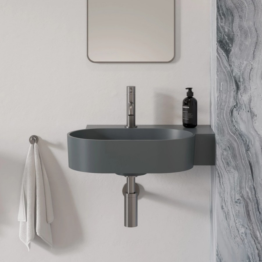 OVO w kolorze ash grey (RAL7022) to umywalka w eleganckim odcieniu ciepłej szarości, o aksamitnej w dotyku, matowej powierzchni.